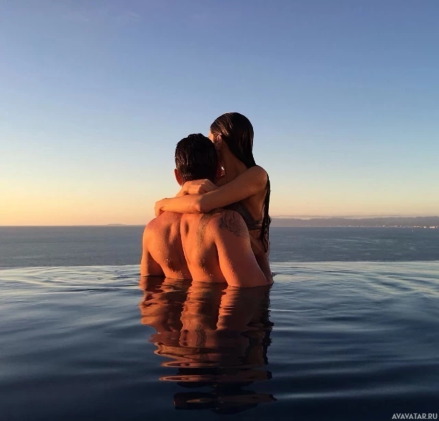 На снимке изображена пара, обнимающая друг друга в океане на закате. Они находятся в воде, обращенные друг к другу и удерживающие друг друга. Это изображение запечатлевает момент интимной связи с фоном красоты природы.