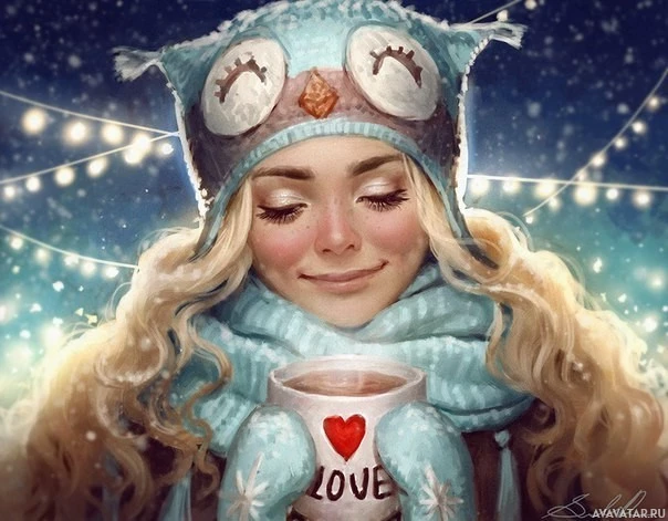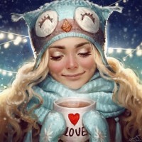 a young woman who appears to be enjoying a warm beverage, possibly tea or hot chocolate, on what looks like a cold night. She's wearing an owl-themed hat and coat, which gives her an adorable appearance. The background suggests it might be wintertime with snow on the ground and string lights in the distance, creating a cozy, festive atmosphere that could be associated with Christmas or a similar