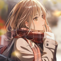 an illustrated character, a girl with brown hair who appears to be enjoying the autumn season. She is wearing a coat and scarf, which are
