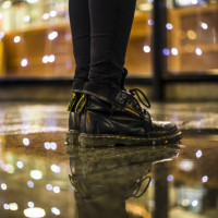 The image shows a pair of black lace-up boots with yellow details, likely reflecting light from the surroundings. They appear to be standing in