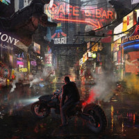 urban scene. In the foreground, there's a person riding a motorcycle through what appears to be a rain-soaked street lined with