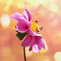 pink flower with a yellow center, which appears to be a dahlia. It is set against