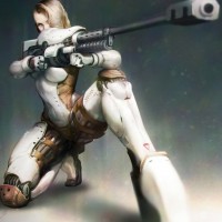 a female character holding a rifle and aiming it. She appears to be in