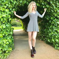 blonde hair and is wearing a short-sleeved, striped dress with a round neckline. Her arms are outstretched as she poses for the photo, and she's also wearing