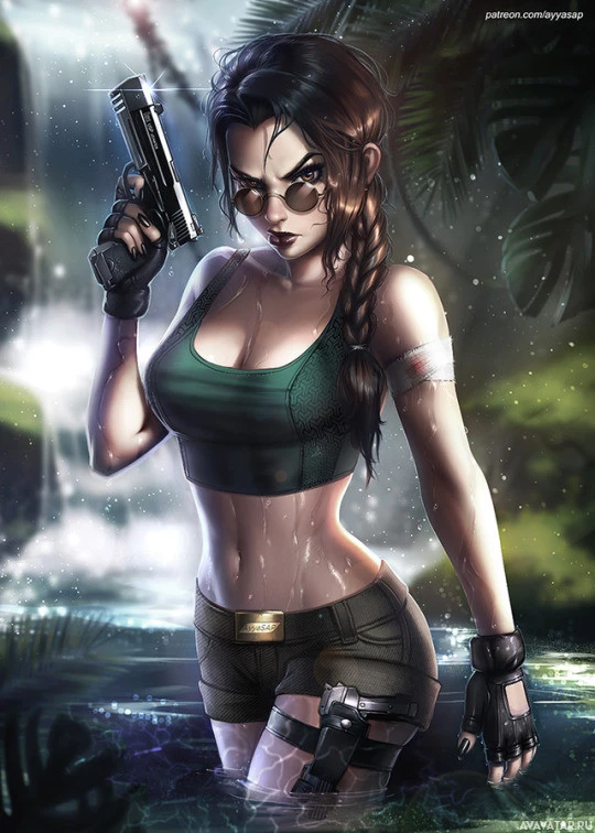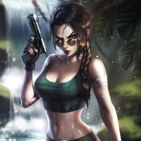 The image depicts a stylized representation of Lara Croft, the protagonist from