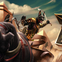 a video game or a piece of concept art for an epic fantasy narrative where Anubis might play a significant role as a character or deity.
