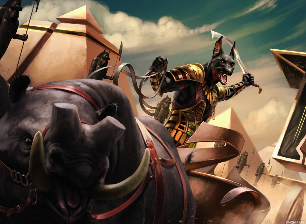 a battle scene with two war elephants charging towards each other, adding to the sense of action and conflict in the image. This could suggest a mythological or historical battle that Anubis might be involved in or overseeing, as he is known to be associated with protection, embalming, and guiding souls into the afterlife in ancient