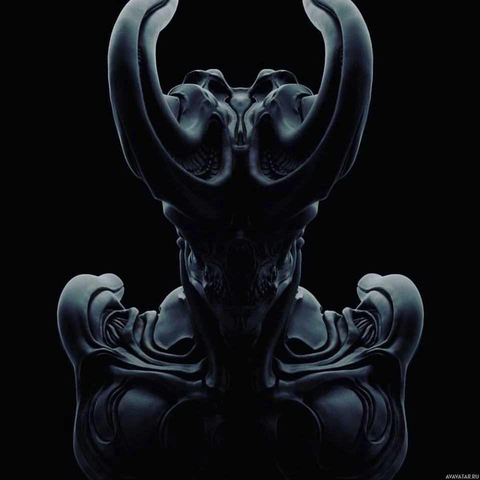 Картинка показывает фантастическое существо с замысловатой, угрожающей внешностью. Он напоминает гуманоидную форму, но украшен роговыми выступами на голове и руках, которые придают ему потусторонний или чудовищный вид. Темная цветовая палитра усиливает его пугающее присутствие. Это существо может быть из фантастической истории, игры или произведения искусства, где такие мифические существа распространены.