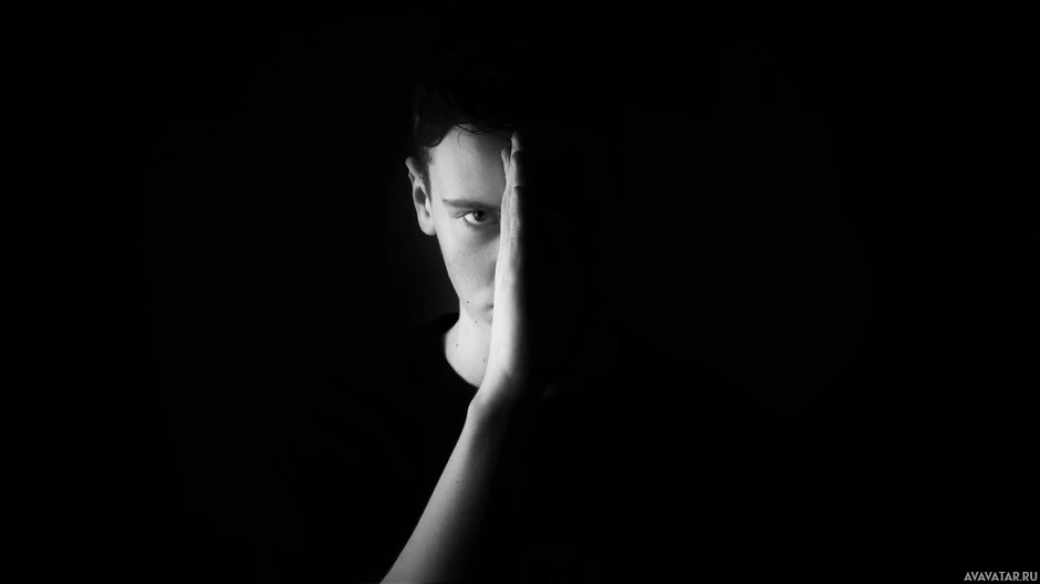 The image features a person on the left side of the frame with a hand raised to their face, covering part of it. They appear to be in