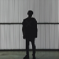 The image shows a silhouette of a person standing in front of a grid-like pattern. The individual appears to be facing the camera, and their head is turned slightly towards the viewer. The background is dark, which contrasts with the illuminated grid, giving the impression that there are lights behind the grid. This creates a silhouette effect where the person's shape can be seen against the bright pattern.