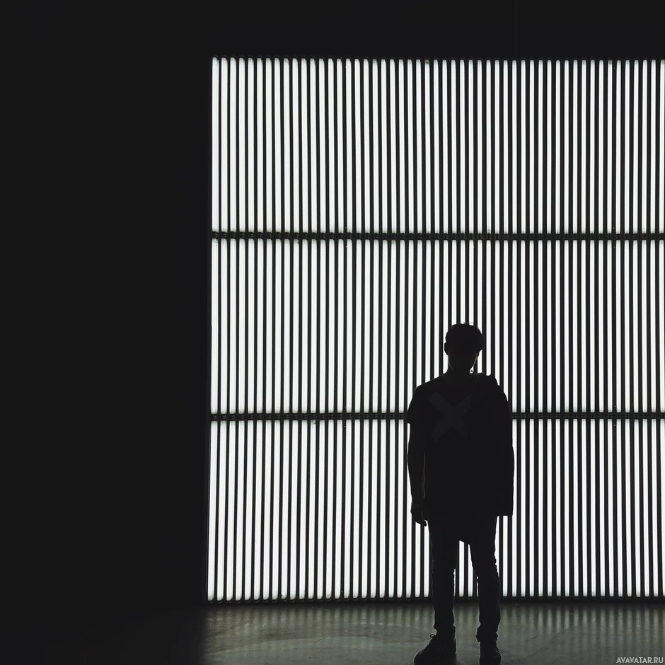 Картинка показывает силуэт человека, стоящего перед сетчатым узором. Человек, кажется, обращен к камере, и его голова слегка повернута к зрителю. Фон темный, что контрастирует с освещенной сеткой, создавая впечатление, что за сеткой есть огни. Это создает силуэтный эффект, когда форму человека можно увидеть по яркому рисунку.