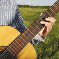 The image features a person's hands playing a guitar. The guitar has six strings and is being played in an outdoor setting with a field of tall grass around. There are no other distinctive objects or people visible in the picture.