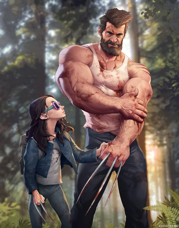 The image depicts an illustration of a character resembling Wolverine from the X-Men comics, standing in a forest setting with a young