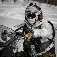 cold weather. They are sitting on a motorcycle, equipped with gear that suggests they may be prepared for action or