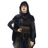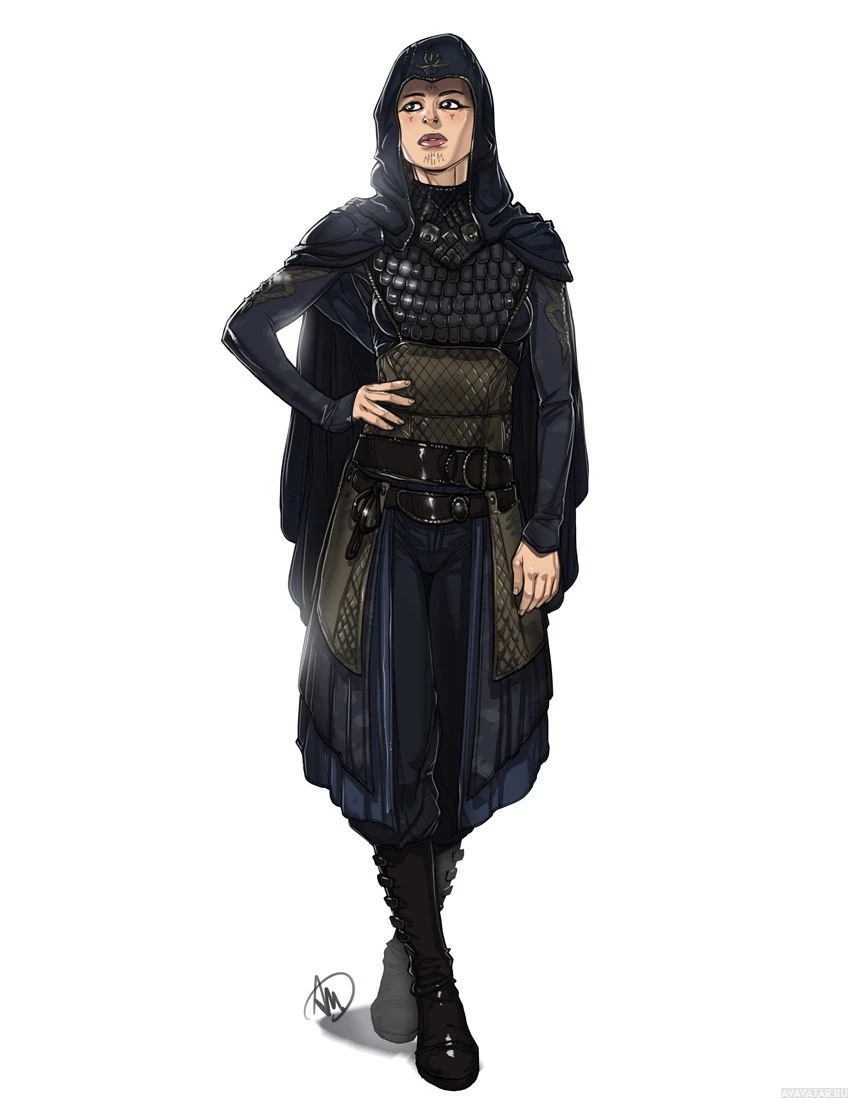 a hooded cloak, armor pieces that cover her torso and arms, and boots with what seems to be strap details for added protection or grip. Her attire suggests she could be from