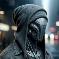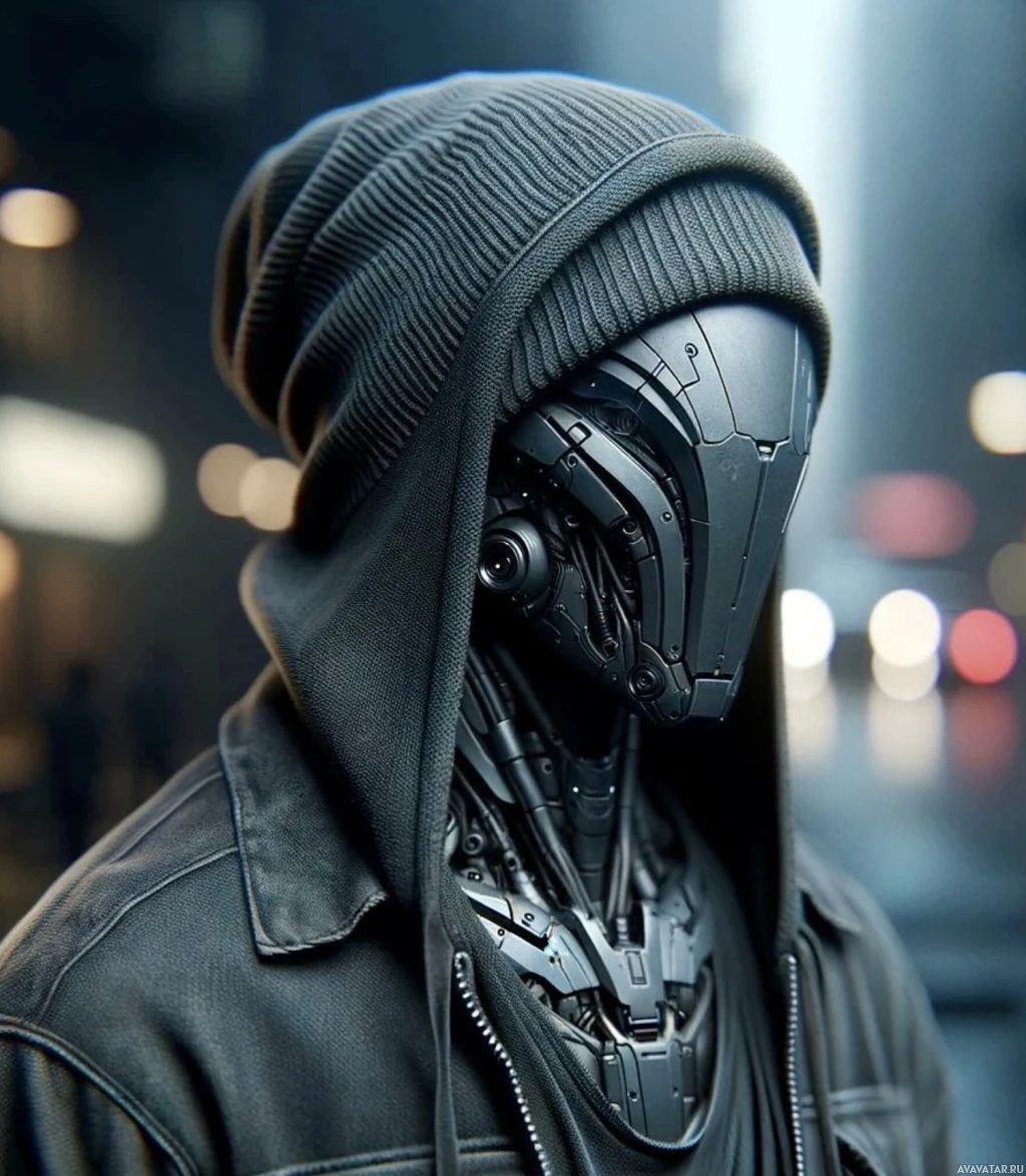 science fiction. The individual has a hoodie on and is wearing a robotic mask or helmet that resembles