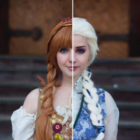 blonde hair styled in braids with blue accents resembling Elsa's iconic hairstyle. They are wearing an outfit inspired by Elsa's costume, including a long-