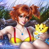 an illustrated character who resembles Misty from the Pokémon series. She is shown in