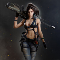 a female character, possibly from a video game or a digital artwork. She is holding a weapon with both hands and appears to be in