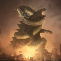 a fantastical scene that appears to be inspired by the Godzilla franchise. In the center of the image, there is a large, menacing dragon with fiery eyes and