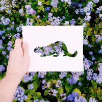 blue flowers, possibly lavender or a similar type of bloom, which provides a colorful contrast to the white silhouette on the card.