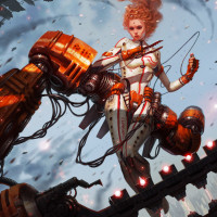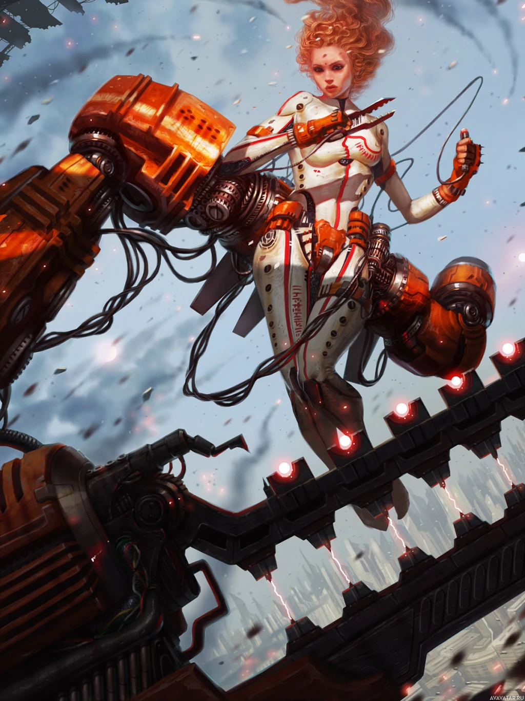 На картинке изображена женщина с рыжими волосами, одетая в футуристический или научно-фантастический наряд. Она, кажется, занята в сцене действия с механическими компонентами вокруг нее. Ее поза предполагает движение и готовность к бою. Настройка включает механические части, которые указывают на передовые технологии или машины.