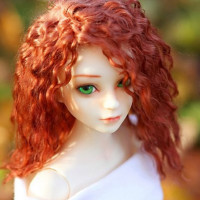red hair. It appears to be designed in a realistic style, with detailed features such as the eyes, eyebrows, and lips that give it a lifelike appearance. The background is softly blurred but seems to depict