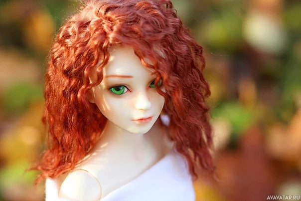 an outdoor setting with what could be leaves or petals on the ground, suggesting a natural environment. The doll itself has a headband or hair accessory that matches its red hair color.