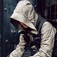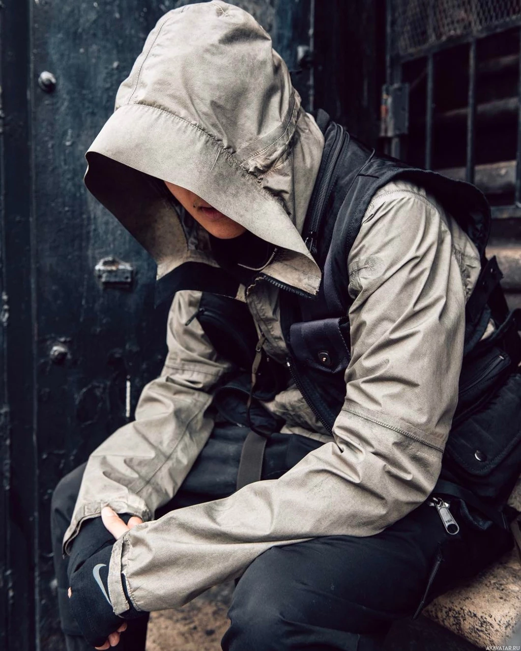 cold weather or some form of outdoor activity requiring protection from the elements. The hood is up, partially obscuring their face and adding to the anonymity of the image.