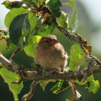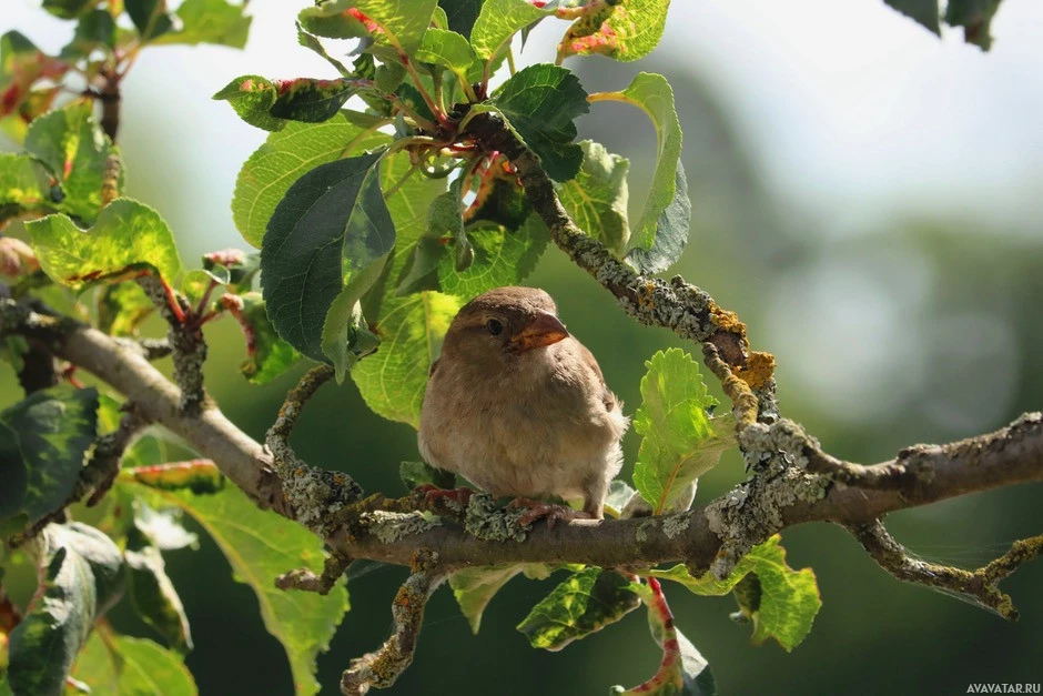 a small bird, commonly known as a sparrow, perched on the branches of an apple tree. The tree has