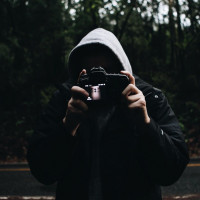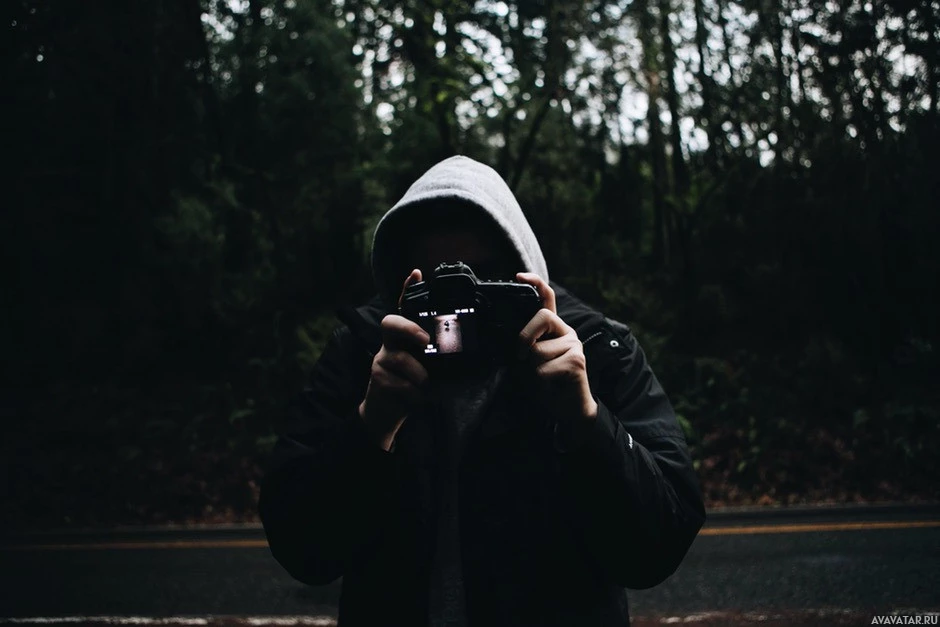 The image features a person holding a camera and taking a photo. The individual is wearing