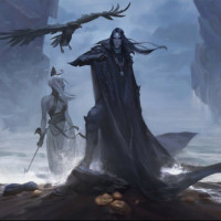 a figure in white, which might represent purity or innocence, standing against a backdrop that suggests an otherworldly or mystical environment, possibly a magical island or a dreamscape. On the right, there is another character dressed in dark, gothic-style attire, holding what looks like a staff or wand adorned with feathers, which might imply witchcraft or sorcery. This character's presence could signify a more sinister, mystical, or even malevolent element to the scene. The overall atmosphere of the image is moody and ethereal, blending elements that could be associated with both
