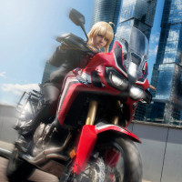 black accents, which is typical of some off-road or adventure-style bikes. The woman is wearing