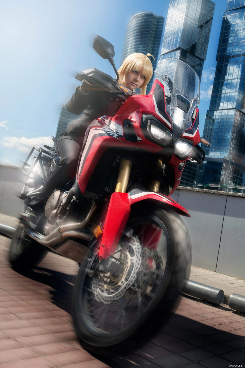 The image features a woman riding a motorcycle. She appears to be in motion, perhaps speeding through