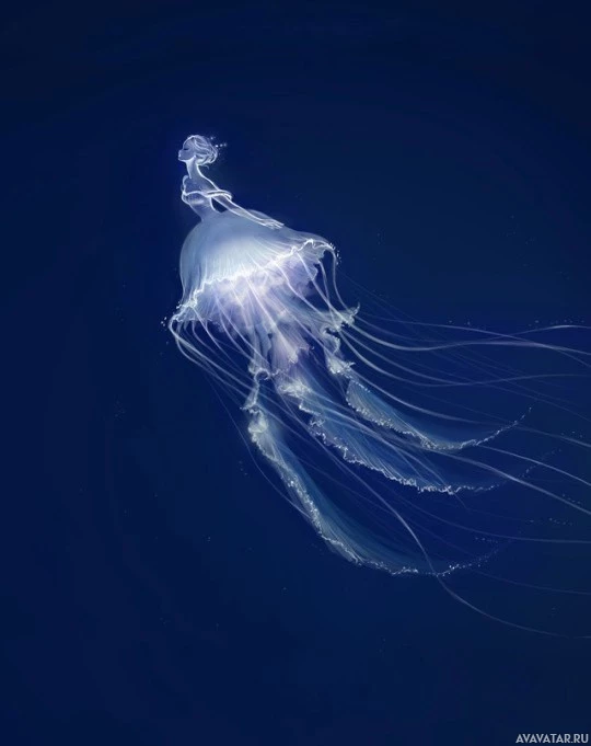 a surreal manner. The girl appears to have the form and features of a jellyfish, which is typically found in