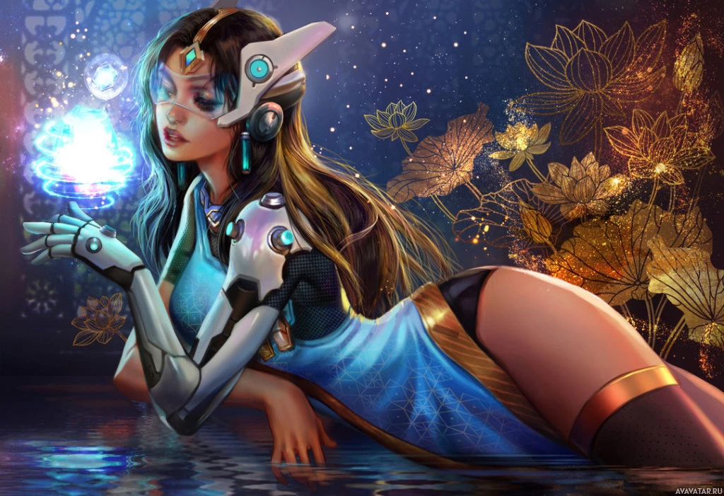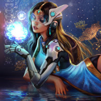 This image depicts a stylized, artistic representation of Symmetra from
