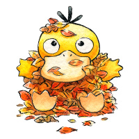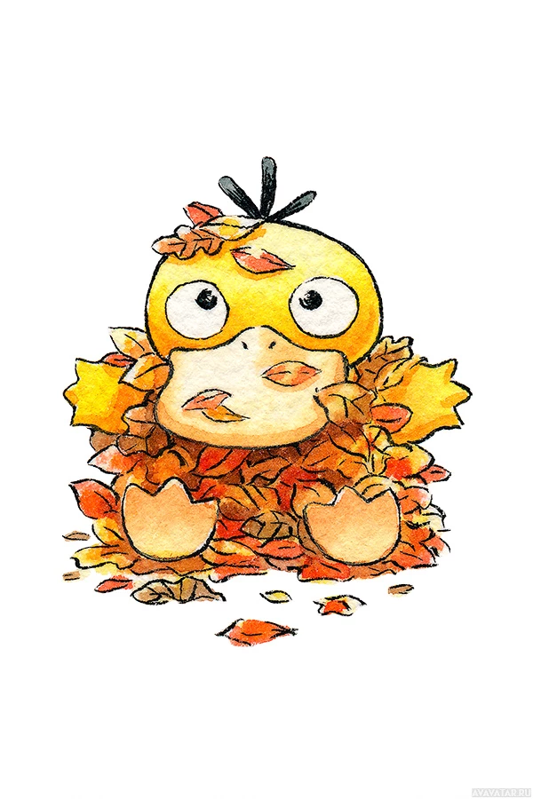 Изображение представляет собой милую, мультяшную иллюстрацию детского персонажа Покемона. Похоже, что это осенний сезон, так как он окружен опавшими листьями, которые обычно ассоциируются с этим временем года.