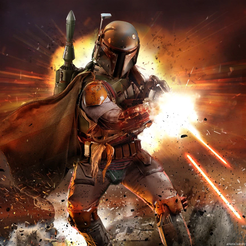 Star Wars" franchise, specifically the Mandalorian, depicted in action. He is wearing his