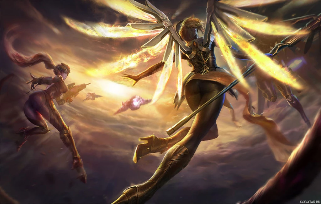 the video game Overwatch, specifically Mercy. This is a digital artwork depicting Mercy in her angelic form, with wings and
