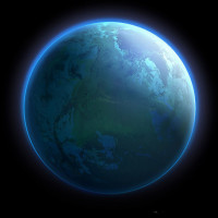The image shows a depiction of a planet. It appears to be an artistic representation rather than a photograph of the Earth, as it lacks realistic features such as clouds and landmasses. The coloration is stylized with blue and green tones that might suggest water and vegetation, respectively, typical of Earth's appearance from space.