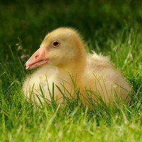 The image shows a small duckling in the grass. It appears to be resting or sitting, and its feathers are light-colored, likely indicating that it is a young bird.