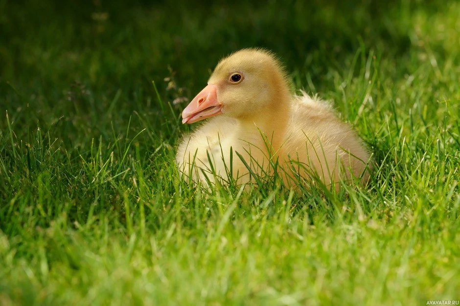 На снимке изображен маленький утенок в траве. Кажется, что он отдыхает или сидит, а его перья светлого цвета, что указывает на то, что это молодая птица.