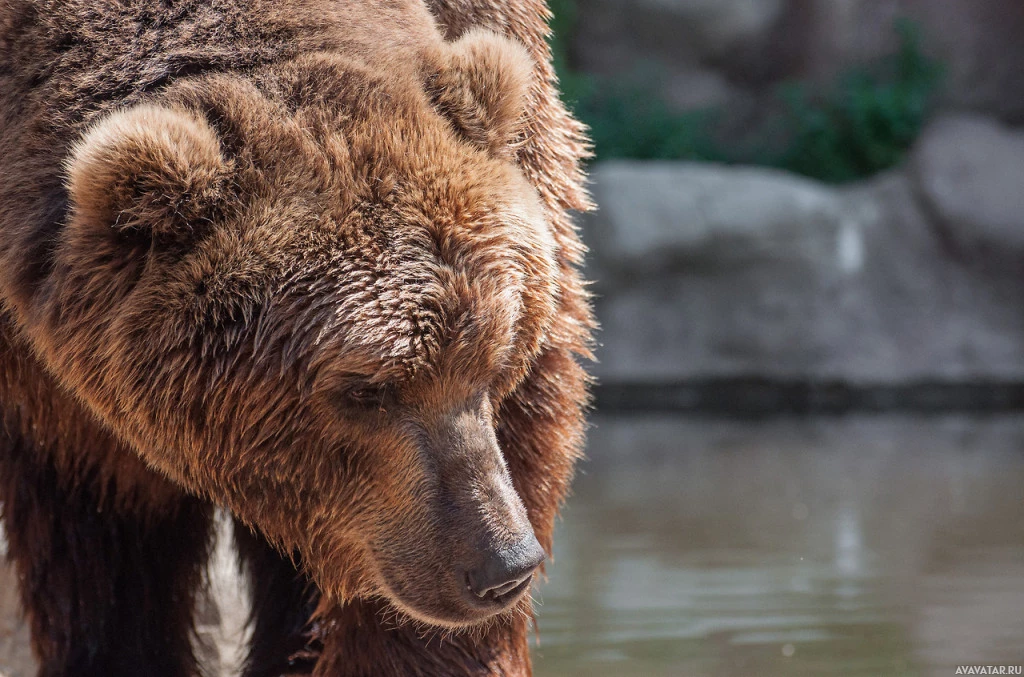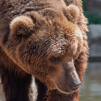 a brown bear, as indicated by the common name "brown bear." The bear is looking down at what appears to be water or possibly
