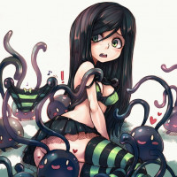 an animated character, a girl with dark hair, sitting among numerous squid creatures. She is wearing