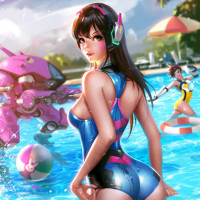 The image features an animated character, D.Va from the video game "Overwatch." She is depicted in her swimsuit, looking back over her shoulder with a smile. The background suggests a tropical or beach setting with palm trees and water. There are also elements of the Overwatch game's logo visible around her, including her helmet and other characters from the game in the distance.