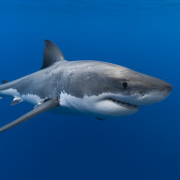 The image shows a shark swimming in the ocean. It appears to be a great white shark, as indicated by its typical gray color with white underbelly and fin tips. The shark is depicted against a blue water backdrop, which suggests it's deep water or possibly a clear tropical sea area.