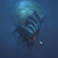 blue water, possibly indicating an underwater setting. There's also what appears to be a smaller figure near the bottom of the image, which could be a human-like character observing or interacting with the monster. The artwork has been created to evoke