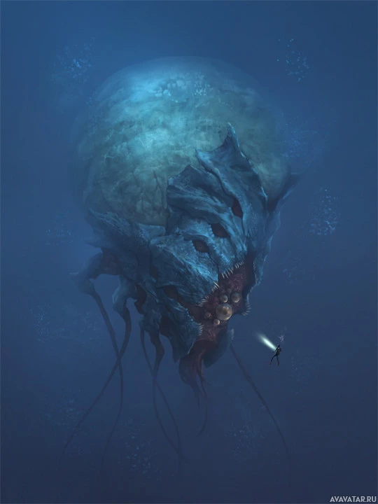 a fantasy creature that resembles a giant squid or octopus, but it is shown with anthropomorphic characteristics. This creature has tentacles like an octopus and is surrounded by deep
