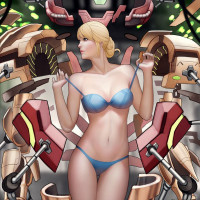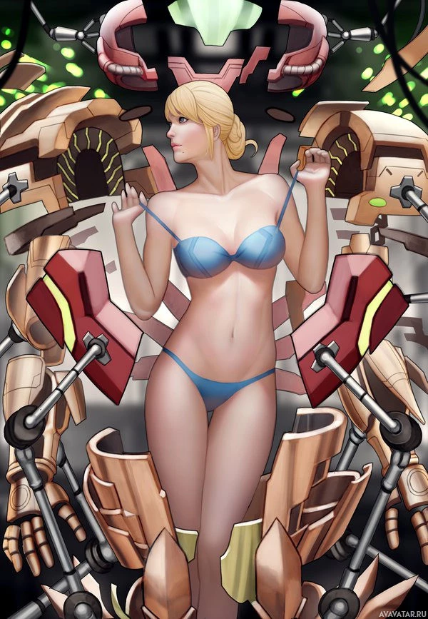 a female character, who appears to be blonde and wearing a blue bikini. She is standing between two large