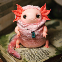 expressive eyes, and it's sitting on what appears to be an old book or parchment, suggesting a magical or fantastical setting.